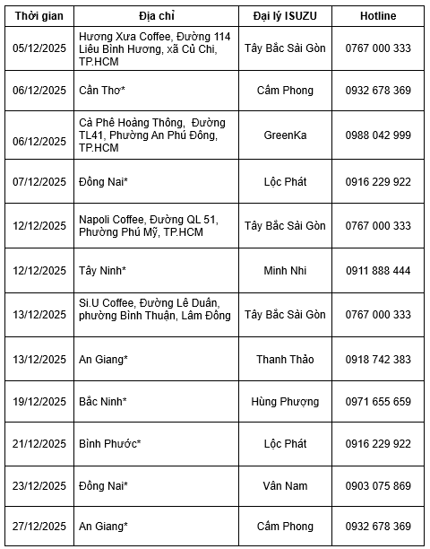 Hãy lưu lại lịch sự kiện Trưng bày & Lái thử xe tháng 12 – 2025 của ISUZU dưới đây và liên hệ với hotline của Đại lý để biết thêm thông tin chi tiết!